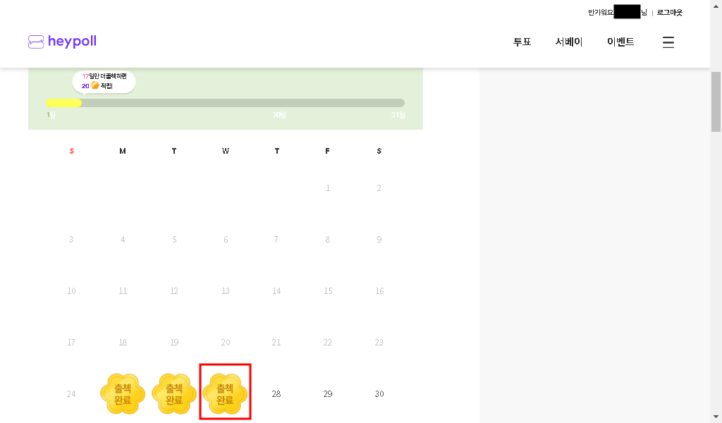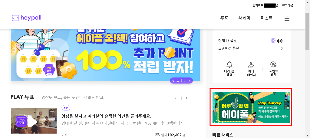 매일 출석체크 하시고 투표에 꾸준히 참여하시면 서베이도 들어와 폴닢을 많이 벌 수 있습니다.
