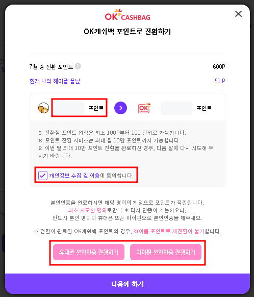 7-3. 전환하실 포인트를 입력하시고 해당 제휴사에 가입되어있는 명의로 본인인증을 하시면 됩니다.