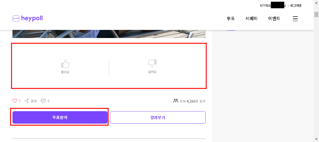 4-2. 참여하지 않은 투표를 선택해서 투표하시고 참여하기를 눌러주세요.