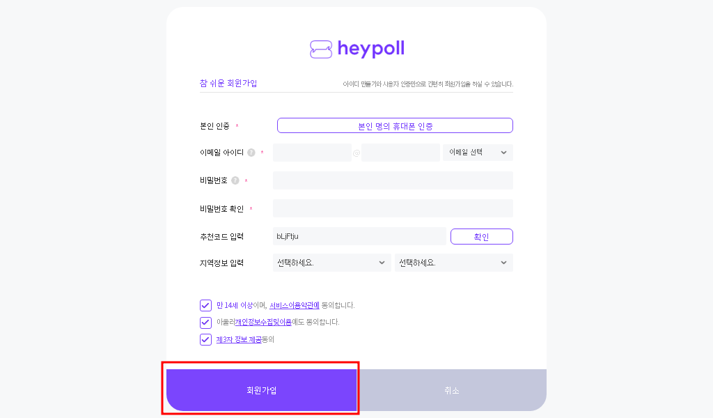 1-3. 휴대폰 인증하시고 정보를 입력하시고 동의에 체크해주세요.