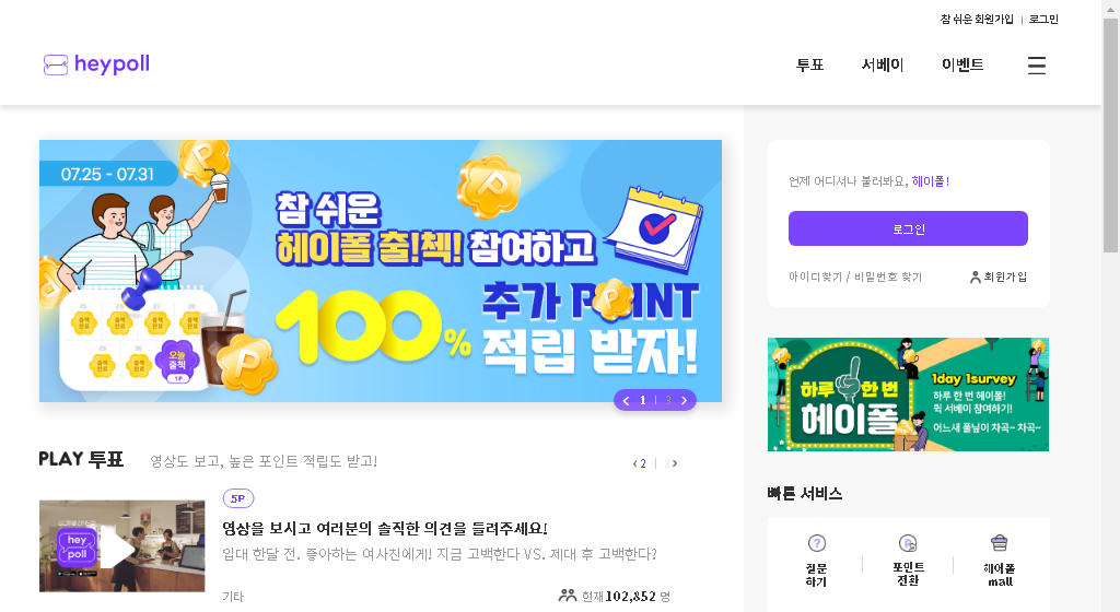 앱테크를 찾아보는데 꼭 앱을 깔지 않아도 되고, 컴퓨터에서도 가능하고, 전환도 쉽게 되는 걸 찾다가 헤이폴이라는 것을 알게 되었습니다. 그래서 헤이폴은 투표와 서베이 참여 등으로 폴닢이라는 것을 벌어서 다른 포인트로 전환할 수 있습니다.