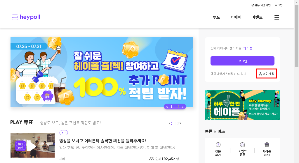 3-1. 헤이폴 메인 화면에 나오는 하루 한번 헤이폴 배너를 클릭해주세요.